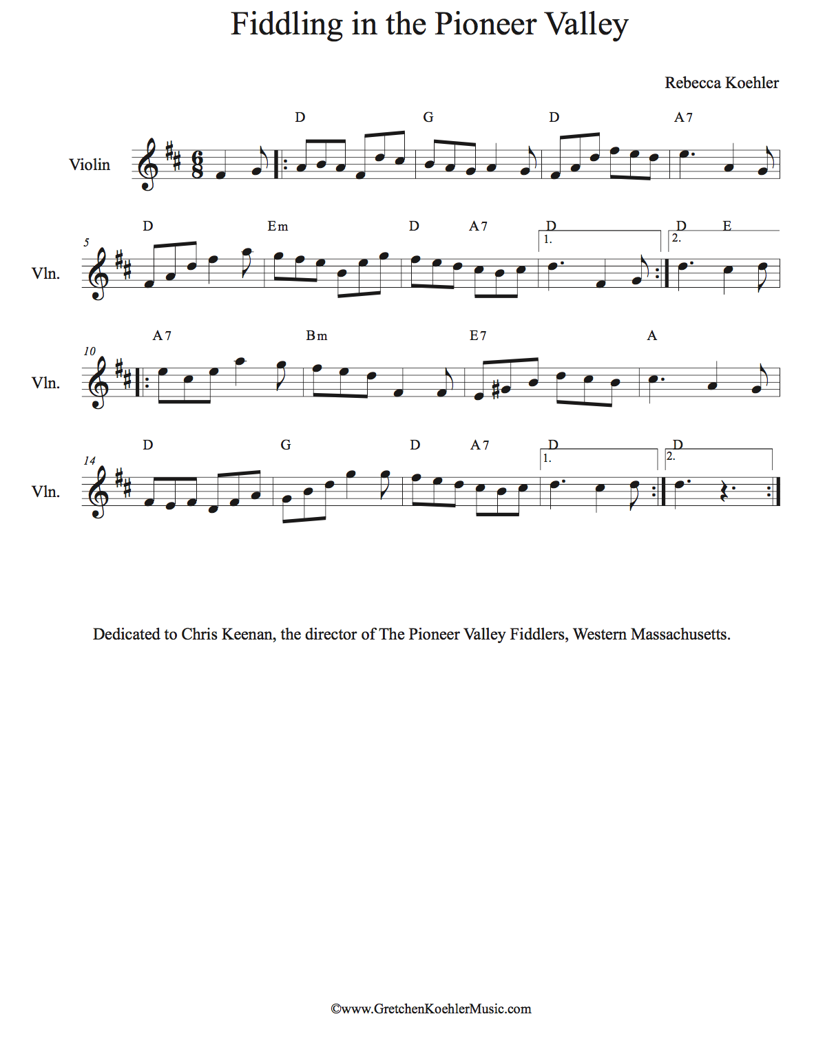 My sister Becky was commissioned to write this jig by Chris Keenan to celebrate her fiddle group, the Pioneer Valley Fiddlers based in Western Massachusetts. While on the phone with Chris discussing the tune, Becky started humming an idea, so she grabbed a piece of paper and pencil and wrote down this jig before the conversation was over! (Wait. What. Wow.)