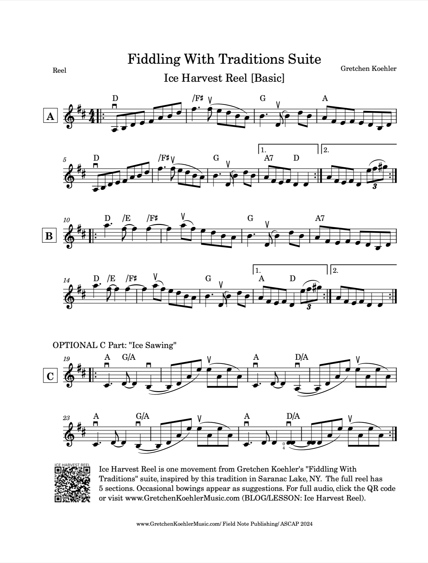 Gretchen Koehler plays and teaches the tune in standard AABB form, including the bonus “Ice Sawing” section.
