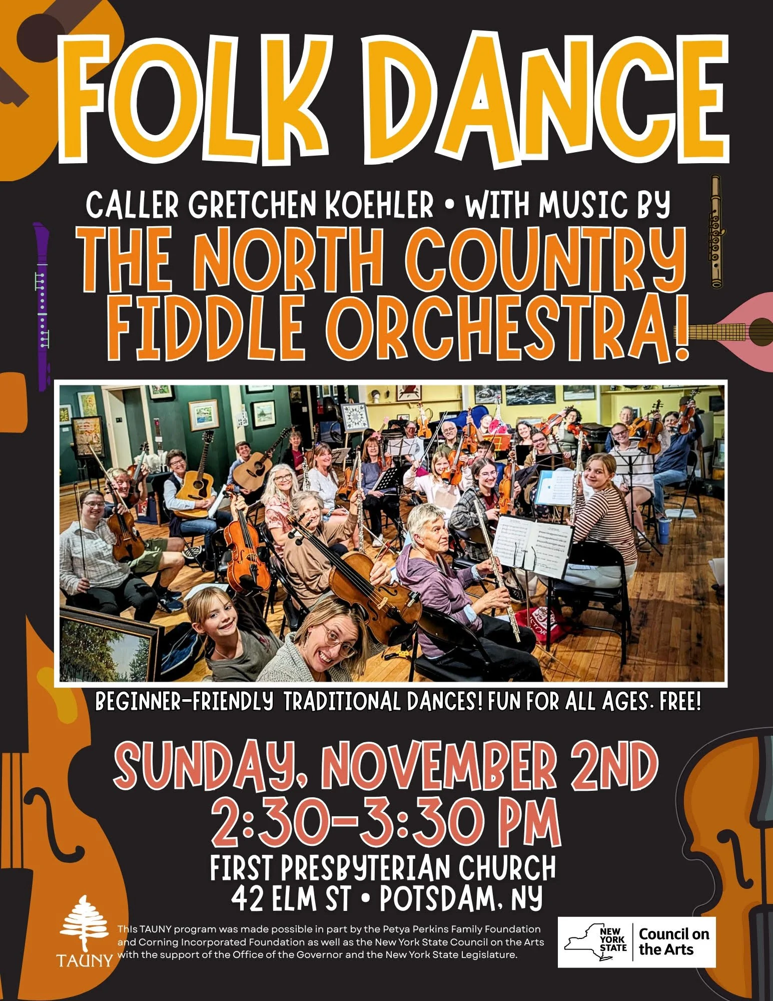 POTSDAM – The North Country Fiddle Orchestra, led by Gretchen Koehler and Barb Heller, is holding a TAUNY-sponsored community dance on Sunday, November 2nd.